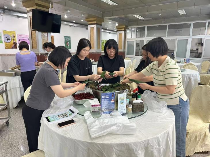 6月5日,食堂內粽葉飄香,歡聲一片。大家互相幫助、互相學習、互相切磋技藝,沉浸在一片歡樂祥和的節日喜慶中。活動現場,糯米、粽葉等必備材料被整齊地擺上桌,大家紛紛向“高手”取經,學習包粽子技巧,折粽葉、填糯米、裹葉子、扎線……只見一雙雙巧手在歡聲笑語中上下翻飛。大家一邊包粽子,一邊聊著節日風俗,很快三角形、喇叭形、牛角形、長條形等各式各樣的漂亮粽子,就這樣一個個在大家手中誕生了整個活動沉浸在一片輕松愉悅的氛圍中,活動結束后大家將親手包的粽子帶回家,跟家人分享節日的喜悅。