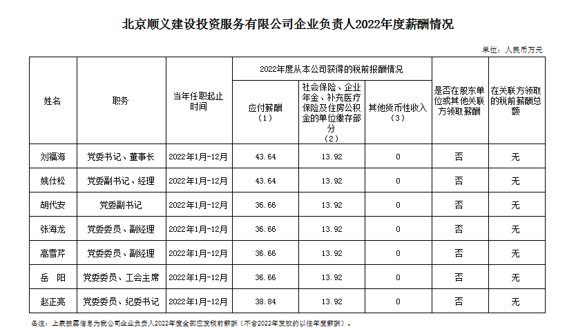 北京順義建設投資服務有限公司企業負責人2022年度薪酬信息披露